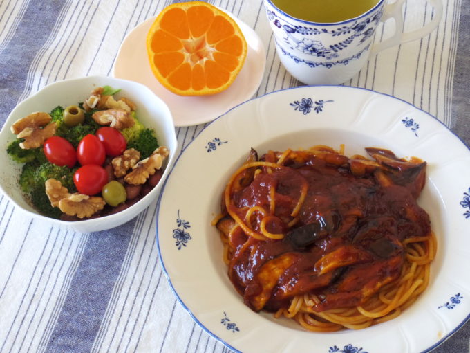 ナスのトマトソース・スパゲティ(乾麺90グラム)、サラダ(ブロッコリー、金時豆、ミニトマト、クルミ、オリーブ。岩塩、黒胡椒、オリーブオイル)、ミカン
