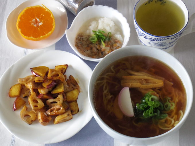 ラーメン(生麺110グラム。ネギ、かまぼこ、メンマ)、レンコンとサツマイモのオイスターソース炒め、おろし納豆(ネギ)、ミカン