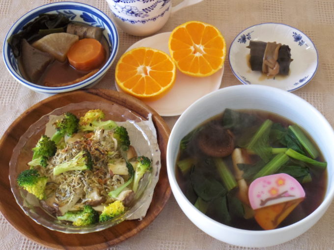 雑煮(切り餅2個、干しシイタケ、かまぼこ、小松菜)、煮物(大根、ゴボウ、ニンジン、コンニャク、丸天、昆布)、アヒージョ(エリンギ、ブロッコリー、チリメン。ガーリックオイル)、昆布巻き、ミカン