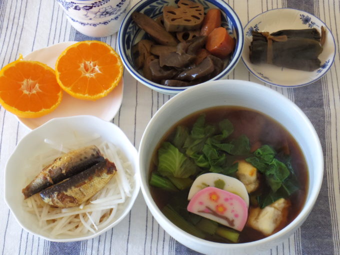 雑煮(切り餅2個、干しシイタケ、餅菜、かまぼこ)、煮しめ、千切り大根とイワシの生姜煮(缶詰)、ゴボウの昆布巻き、ミカン