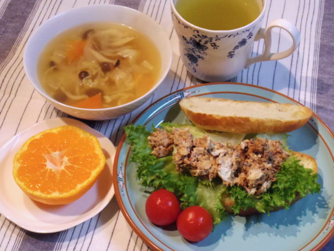 イワシのサンドイッチ(ブール2枚。フリルレタス、イワシ缶、タマネギ、マヨネーズ。ミニトマト)、スープ(タマネギ、ニンジン、キャベツ、シメジ)、ミカン