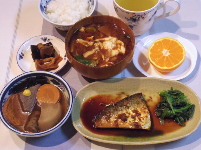 ご飯、味噌汁(大根、シメジ、小松菜、卵)、サバの生姜煮(ホウレンソウ)、煮物、昆布巻き、ミカン