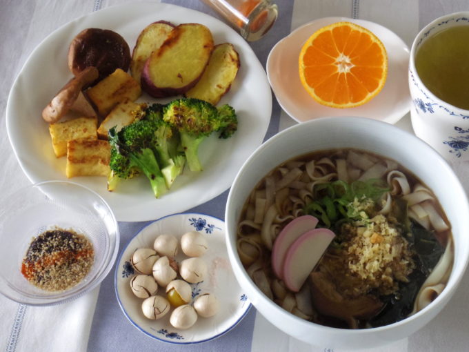 きしめん(乾麺90グラム。干しシイタケ、ワカメ、ネギ、かまぼこ、天かす)、焼き物(サツマイモ、シイタケ、ブロッコリー、厚揚げ。甘味噌)、ギンナン、ミカン