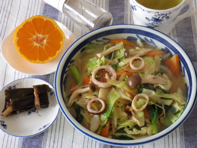 ちゃんぽん(タマネギ、ニンジン、キャベツ、エノキダケ、シメジ、小松菜、ちくわ、イカ)、ゴボウの昆布巻き、ミカン