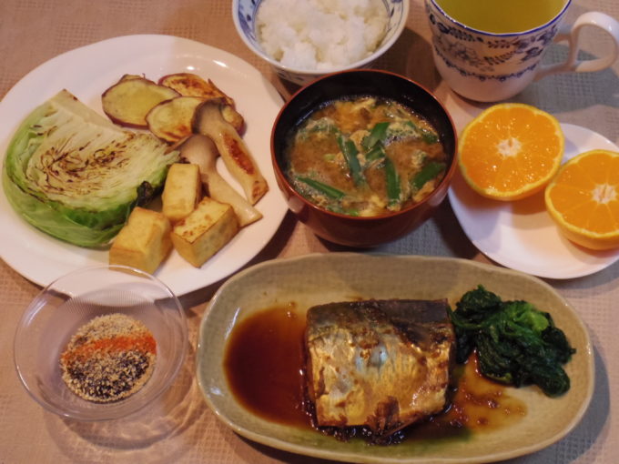 ご飯、ニラと卵の吸い物、サバの生姜煮(ホウレンソウ)、焼き物(キャベツ、サツマイモ、エリンギ、厚揚げ。甘味噌、ごま)、ミカン