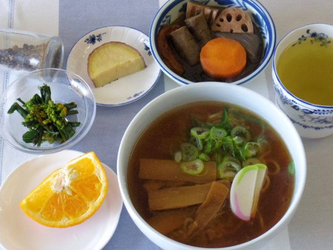 ラーメン(生麺110グラム。ネギ、カマボコ、メンマ)、根菜の煮物(ゴボウ、レンコン、ニンジン、コンニャク、丸天、昆布)、コウサイタイのおひたし、サツマイモのレモン煮、伊予柑