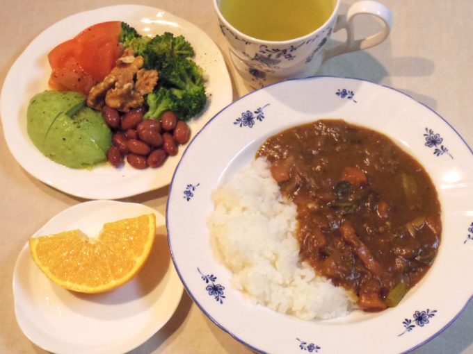 カレーライス(ご飯。タマネギ、ニンジン、ナス、ブロッコリーの茎、シーフードミックス)、サラダ(アボカド、金時豆、ブロッコリー、トマト、クルミ)、はっさく