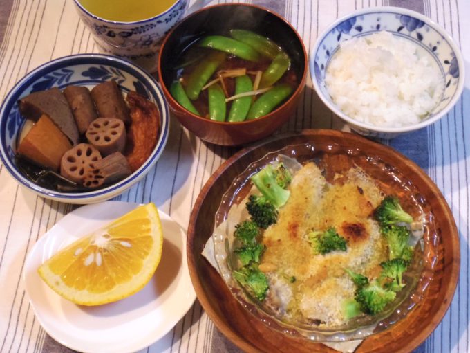 ご飯、味噌汁(サツマイモ、エノキダケ、サヤエンドウ)、アジのパン粉焼き(ブロッコリー)、根菜の煮物、はっさく