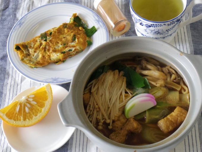 味噌煮込みうどん(ネギ、シメジ、エノキダケ、カマボコ、油揚げ)、ニラの卵焼き、はっさく