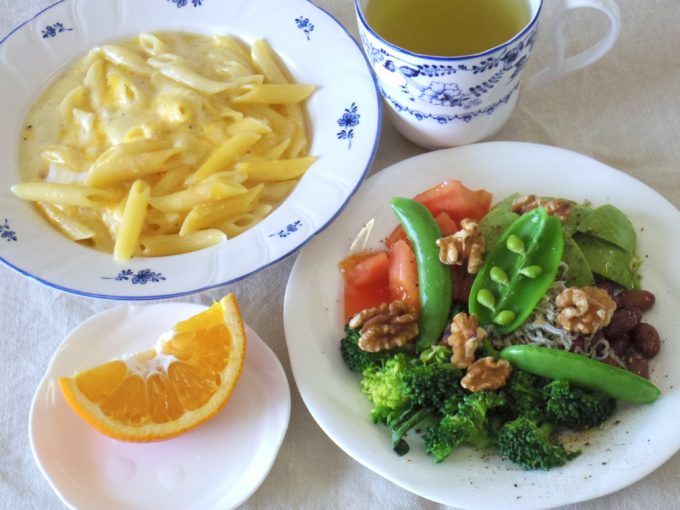 ペンネ・カルボナーラ(乾麺90グラム。卵、ガーリックオイル)、サラダ(金時豆、アボカド、ブロッコリー、トマト、スナップエンドウ、クルミ。岩塩、ブラックペッパー、オリーブオイル)、伊予柑