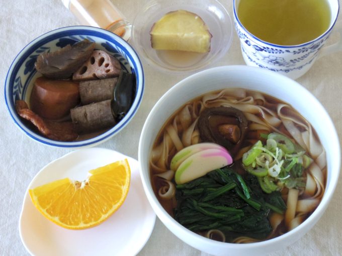きしめん(乾麺90グラム。干しシイタケ、ネギ、カマボコ、ほうれん草)、根菜の煮物、サツマイモのレモン煮、はっさく