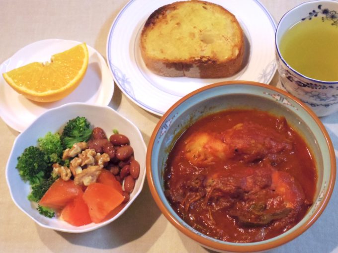 バタールのガーリックトースト、エビとタラのトマトソース煮込み(タマネギ、ピーマン)、サラダ(ブロッコリー、金時豆、トマト、クルミ)、はっさく