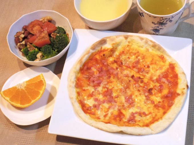 ピザ、コーンスープ、サラダ(金時豆、ブロッコリー、トマト、クルミ)、不知火