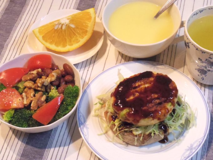 ハンバーグのオープンサンド(バタール、キャベツ、白身魚のハンバーグ)、コーンスープ(インスタント)、サラダ(金時豆、ブロッコリー、トマト、クルミ)、はっさく