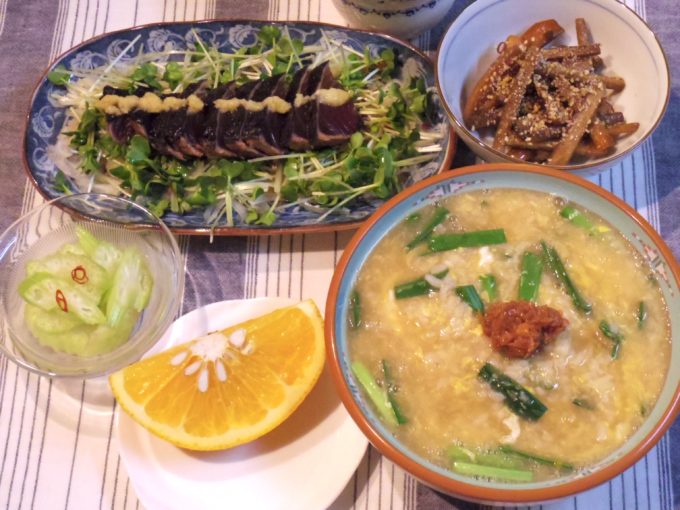 ニラと卵の雑炊(梅干し)、カツオのたたき(タマネギ、カイワレ大根)、ゴボウとニンジンのきんぴら、セロリの甘酢漬け、はっさく