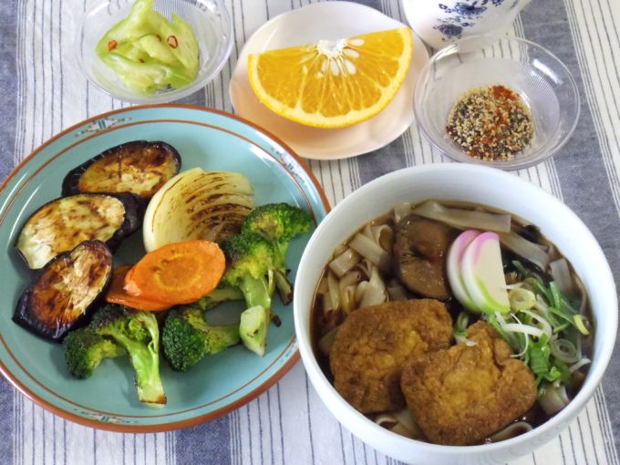キツネきしめん(乾麺90グラム。干しシイタケ、ネギ、カマボコ、油揚げ)、焼き野菜(タマネギ、ニンジン、ブロッコリー、ナス。甘味噌)、セロリの甘酢漬け、はっさく