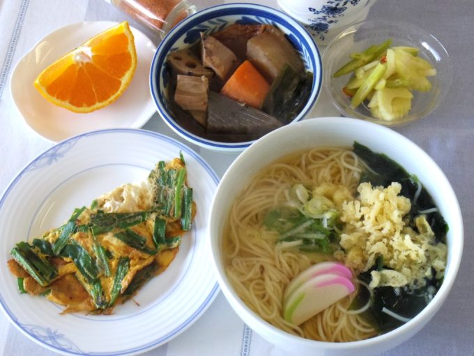 にゅうめん(乾麺90グラム。ワカメ、ネギ、カマボコ、天かす)、根菜の煮物、ニラの卵焼き、セロリの甘酢漬け、不知火