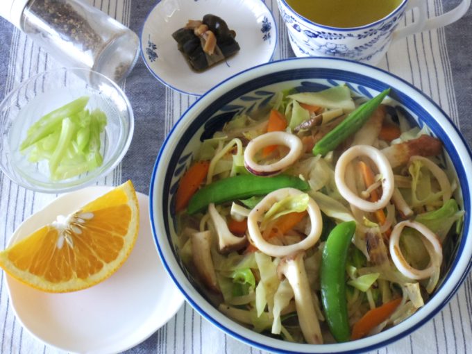 ちゃんぽん(タマネギ、ニンジン、キャベツ、エノキダケ、エリンギ、スナップエンドウ、ちくわ、イカ)、昆布巻き、セロリ、はっさく