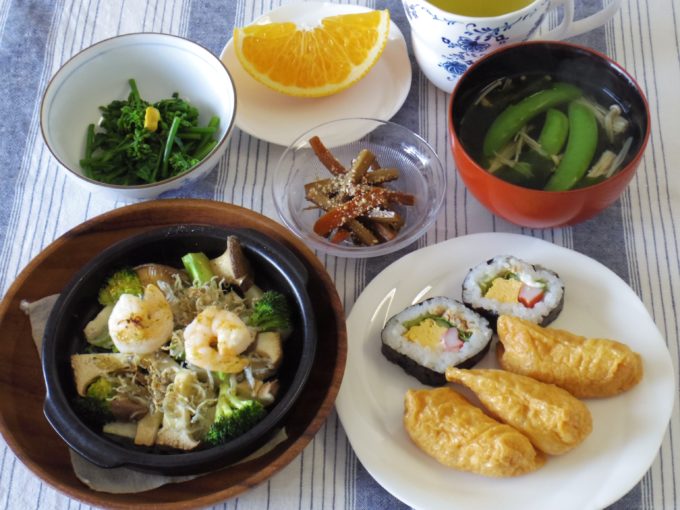 いなり寿司、サラダ巻き、吸い物(ワカメ、エノキ、スナップエンドウ)、アヒージョ(エリンギ、エビ、ブロッコリー、ちりめん。ガーリックオイル)、ゴボウとニンジンのきんぴら(ごま)、菜花のおひたし、はっさく