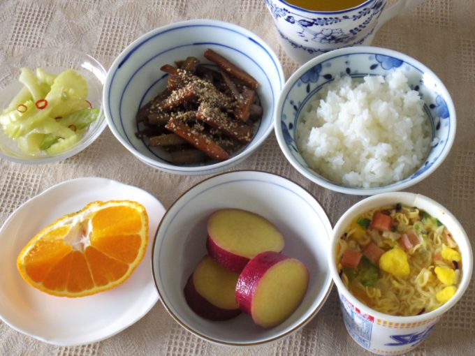 ご飯、カップ麺、ゴボウとニンジンのきんぴら、サツマイモのレモン煮、セロリの甘酢漬け、不知火