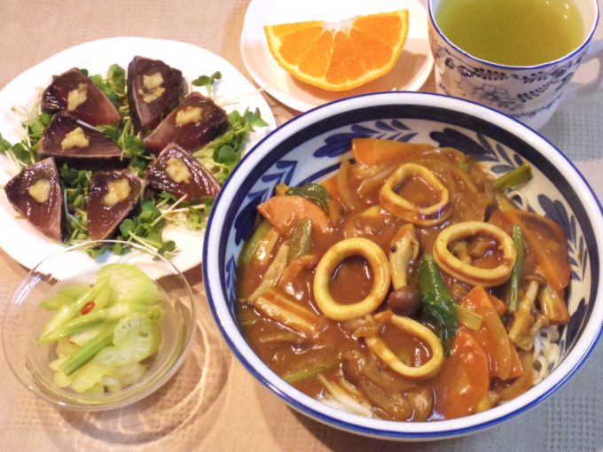 カレーうどん(乾麺90グラム。タマネギ、ニンジン、ナス、シメジ、ちくわ、イカ)、カツオのたたき(カイワレ大根)、セロリの甘酢漬け、不知火