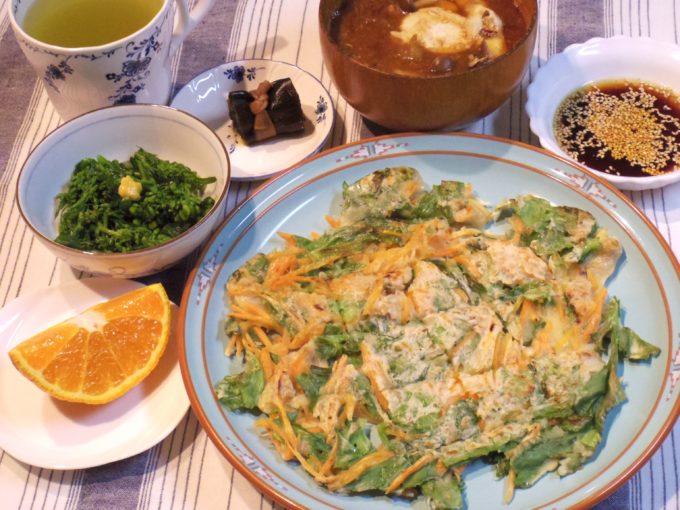 チヂミ(セロリの葉、ニンジン、アサリのむき身)、味噌汁(シメジ、ナス、サツマイモ、卵)、菜花のおひたし、昆布巻き、不知火
